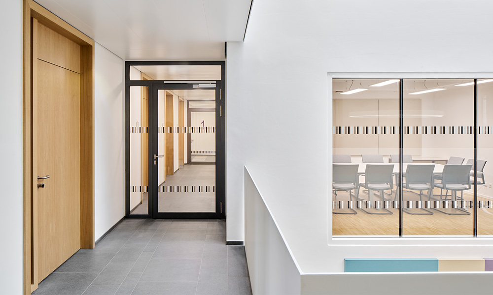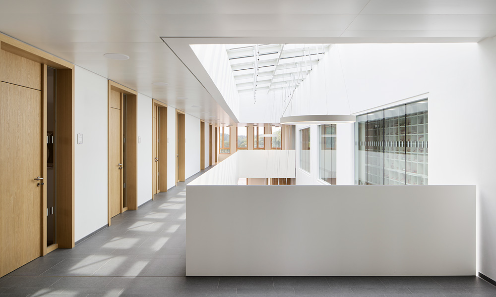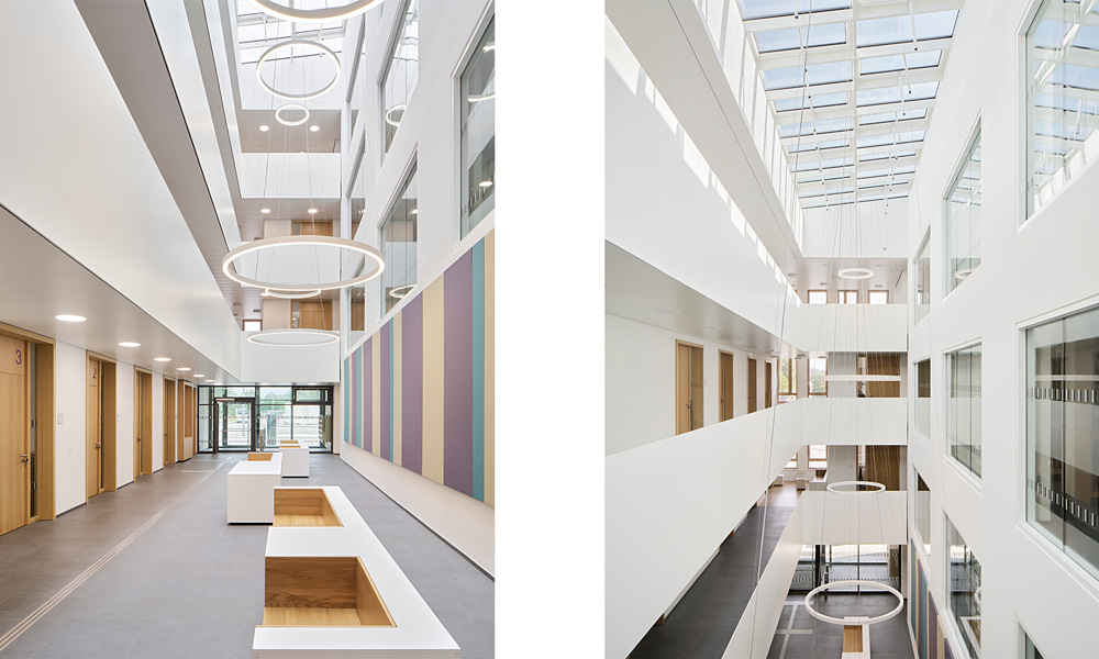 Die Erschließung des Neubaus erfolgt über einen städtischen Platz an der Herzog-Adolf-Straße. Der daran anschließende Haupteingang führt in ein durchgehendes Foyer, das sich auch zum Außenraum mit Parkplatz auf der Westseite öffnet.